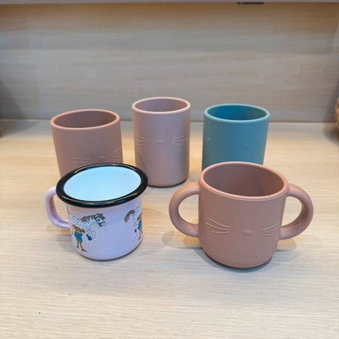 Pent brukte barneskjeer fra Liewood x 4 stk, samt to silikonskjeer kjøpt i Spania.