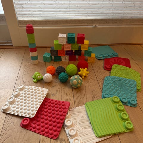 Utviklingskube for babyer, egnet fra ett år. Fem sider med forskjellige oppgaver.