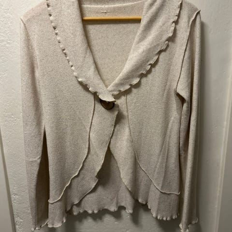 Cardigan/strikkejakke med to knapper i halsen. Fin fasong. Svært lite brukt. Bomull/ akryl. Merke: Signature.