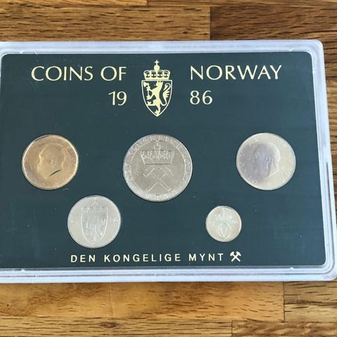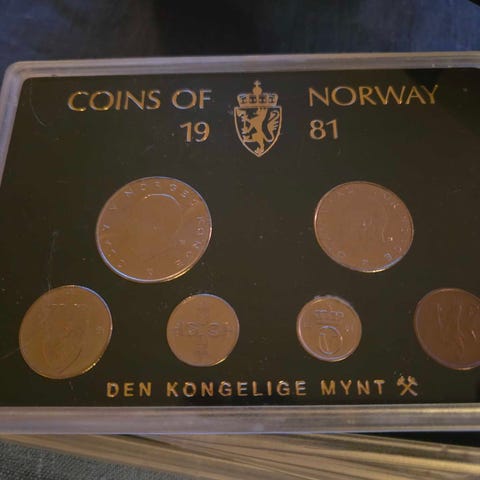 Den Kongelige Mynt Coins of Norway myntsett fra 1983,84 og 85med flere mynter i original emballasje. Myntsettet inneholder ulike valører preget i metall, pakket og coinnet ved Den Kongelige Mynt i Kongsberg.