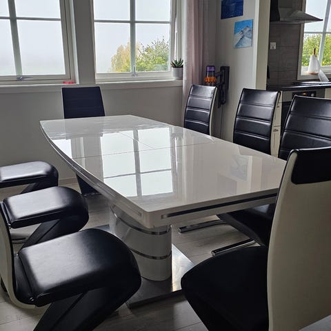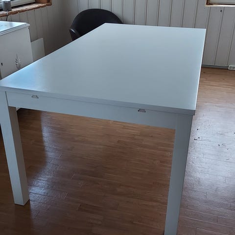 Spisebord selges. Bordet har merker i bordplaten etter ett uhell med superlim. Men tenker det kan fikses med kontaktplast eller lignende.