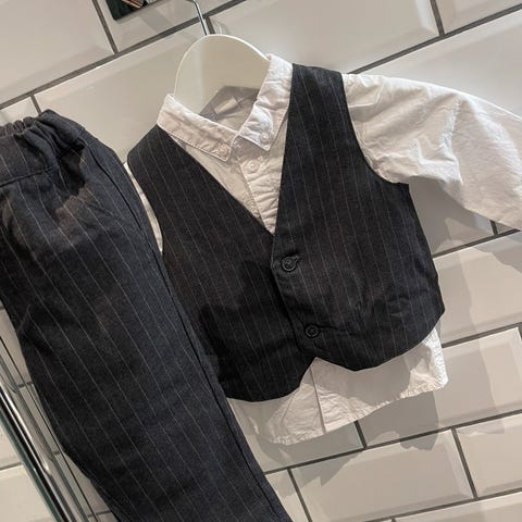 Nydelig pendress brukt av et barn. Dressbukse, hvit skjorte og vest. Dressen er hel, pen og ren, uten flekker.