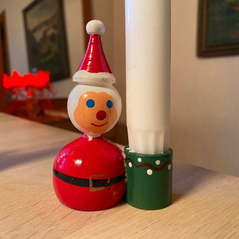 Samling av julenisser og julefigurer i forskjellige størrelser og materialer.