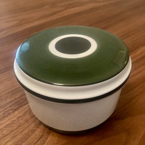 porselen, porselenskrukke, krukke med lokk, håndlaget, kunsthåndverk, keramikk, norsk design, vintage, retro, signert, unik, samlerobjekt, dekor, smykkeskrin, liten krukke, kunstkeramikk, 1980-tallet