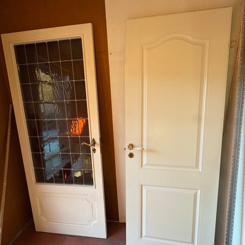 Hvit innerdør med seks paneler og messing dørhåndtak. 80cm bred.