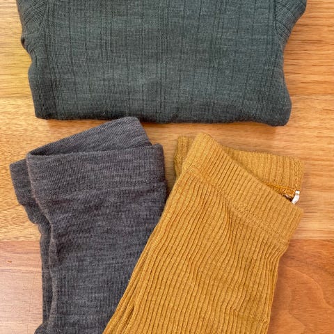 Ullbukse fra Name it str. 56, body fra Joha str. 60 og et par ullsokker fra Cubus. Sokkene er litt nuppete, eller er klærne pent brukt og uten slitasje.