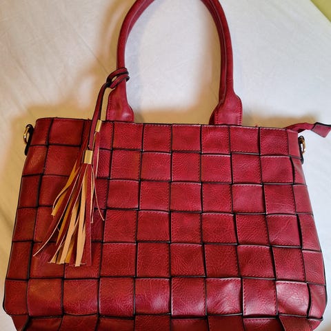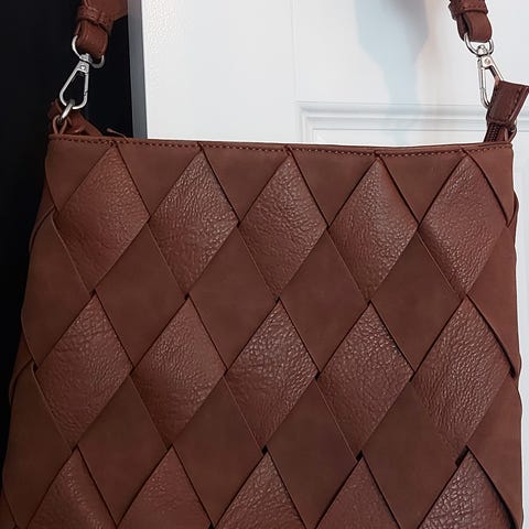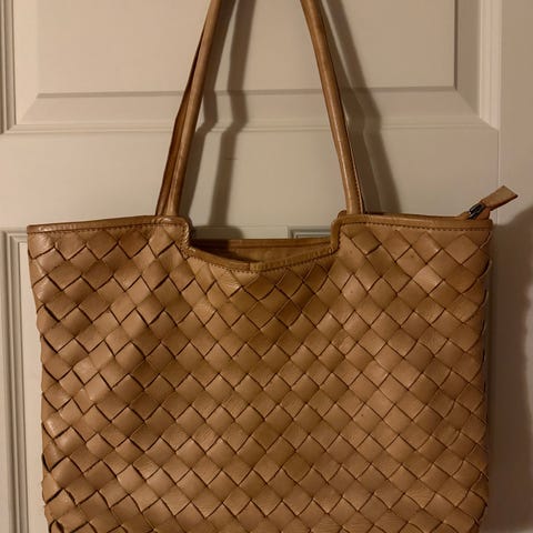 Ubrukt, ny veske i flettet brunt skinn, designet for hånd eller skulderbæring.