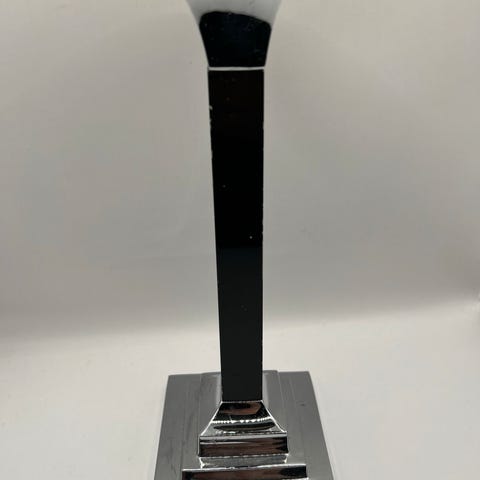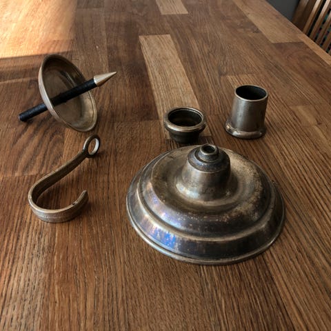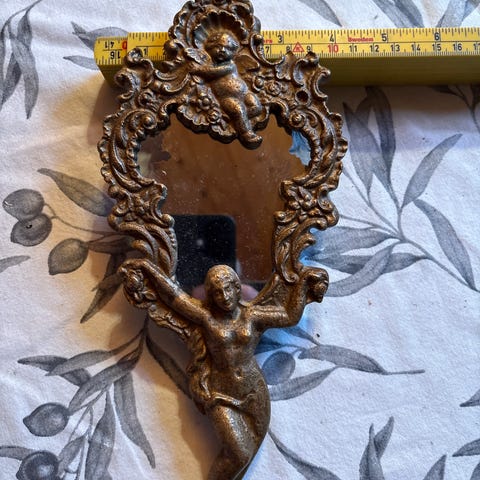 Har ikke informasjon om årstall og materiale. Men den er tung. Ikke tinn tror jeg