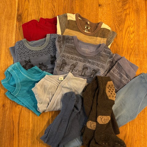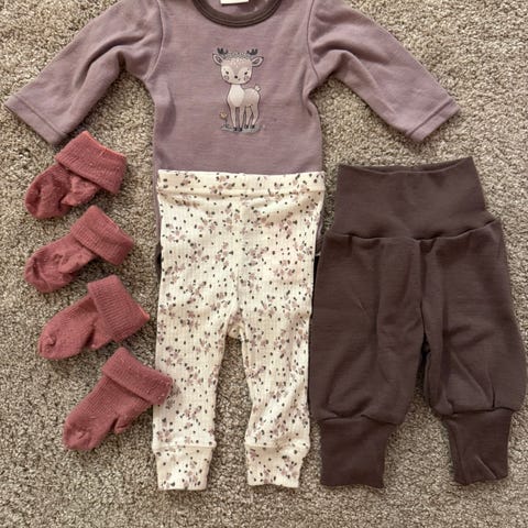 Kjempefint ullsett fra Name it str. 62 og to par ullsokker fra Cubus. Ullsokkene er litt nuppete, ellers er klærne lite og pent brukt.