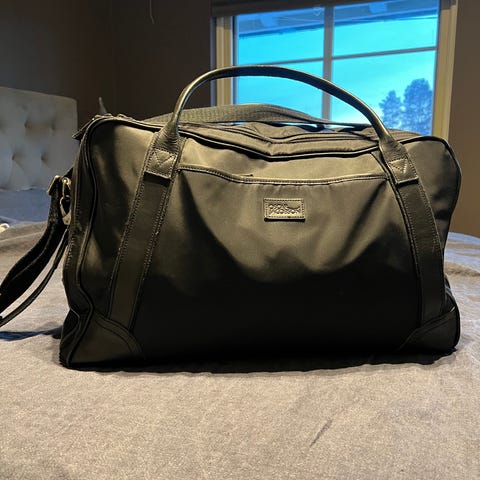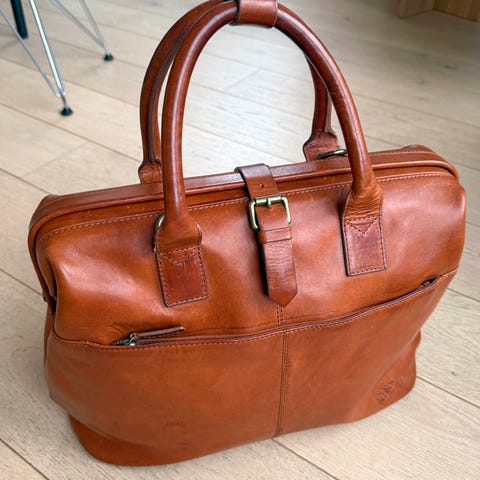 Flott Oscar Jacobsen weekend bag, laget i marine blått stoff og lær. Den har en romslig hovedlomme med glidelås og flere mindre lommer for organisering. Egnet for reise eller fritidsbruk.