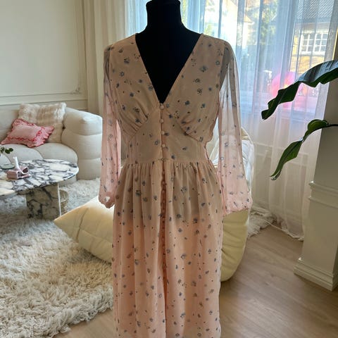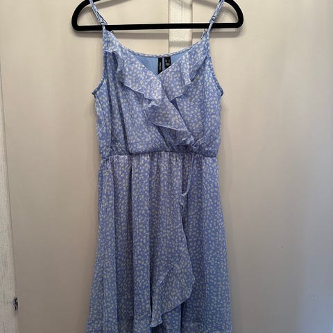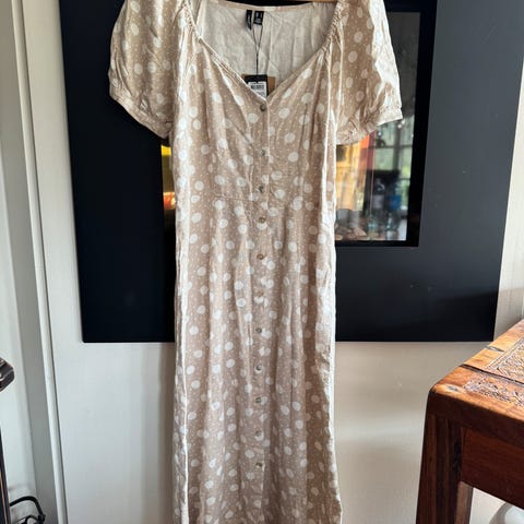 Vero Moda sommerkjole i størrelse S. Kjolen er grønn med hvite prikker og laget av viskose. Den har kort erme og omslagsdesign med knyting i siden.