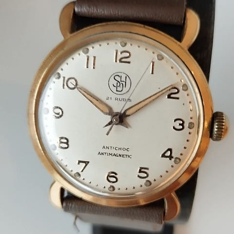 Pen gammel(50-tallet) Olympia De luxe. Tikker og går. Sitter på en nydelig brun skinnreim med gull spenne. Ligger fint på hånden med sine 33mm.