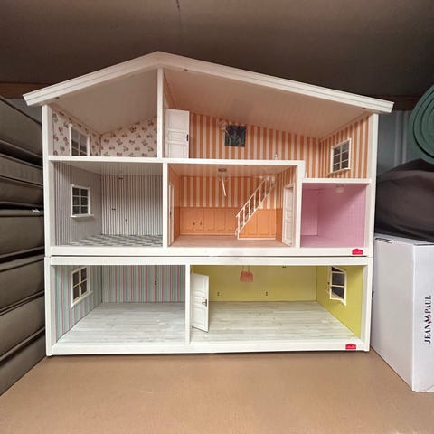 Lundby dukkehus med flere rom og trapper. Dukkehuset har fargerike vegger og tak, med vinduer på sidene. Passer som leke- og innredningsobjekt for barn.