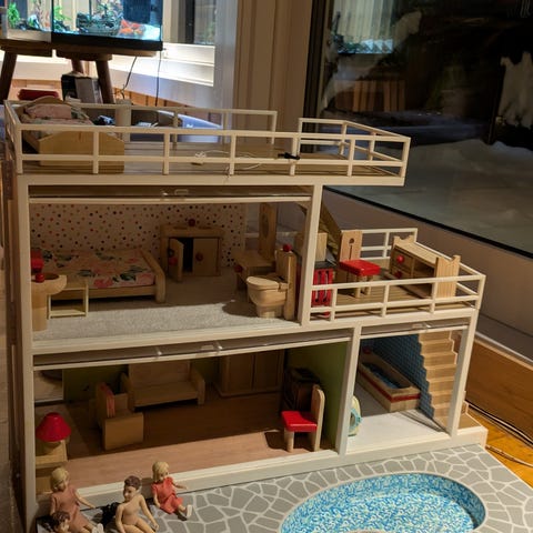 Pusset opp vegger, gulv og tak. Uten møbler og figurer. Usikker om lys fungerer, da vi ikke har prøvd dette.