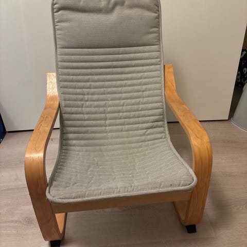 IKEA lenestol til barn med trekk i stoff med dinosaurmønster. Lenestolen har en ramme i lyst tre og er designet for barn. Mål: 66 cm høyde, 43 cm bredde, 38 cm dybde.