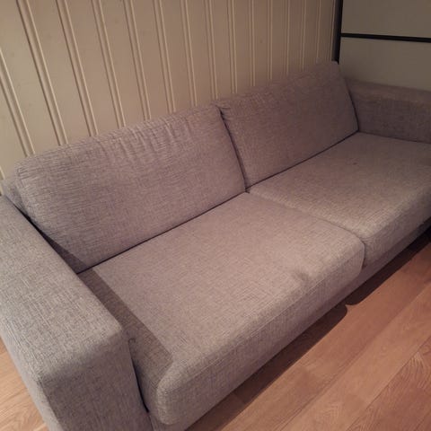 Sofaen er som sagt godt brukt og har noen skjolder og flekker(se bilder). Mesteparten av dette tror jeg kan renses bort. Noen av putene har også vridd seg litt i trekkene, men det kan sikkert også rettes på.