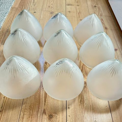 Skjermen er forholdsvis ny, og uten flekker og slitasje. Den er i 100% bomull i offwhite med frøskall. Stoffet i skjermen gir et varmt lys. Diameteren på skjermen er 40 cm. På toppen er diameteren 18 cm. Høyde på skjermen er også 18 cm. På bilde 17 vises skruen som regulerer vinkelen på skjermen, den er litt vanskelig å skru. Det har likevel ikke vært noe problem å stille vinkelen på skjermen.