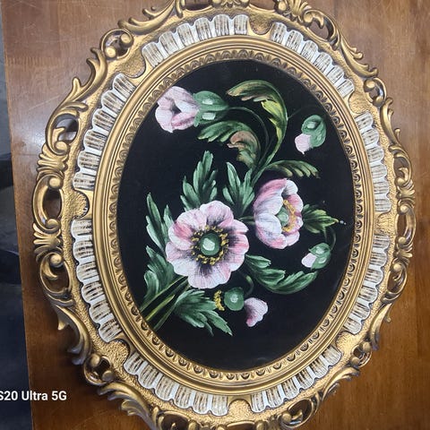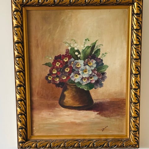Akrylmalery som viser en bukett med rosa blomster. Maleriet har en teksturert overflate med tydelige penselstrøk. Fargene domineres av nyanser av rosa, grønt og gult på en lys bakgrunn. 50cm/60cm