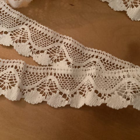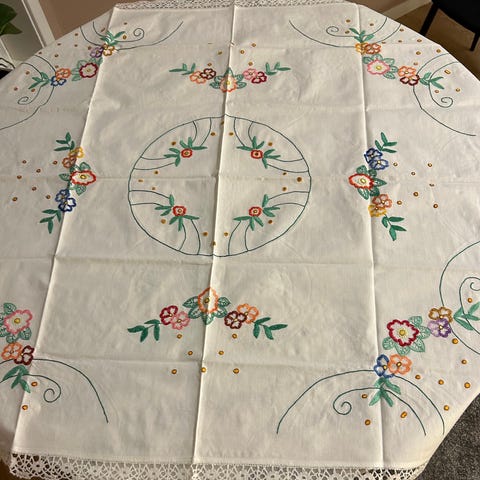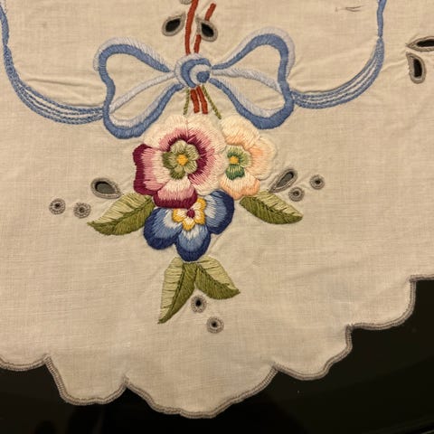 Brodert dukesett med blomstermotiv bestående av flere duker i ulike former og størrelser.