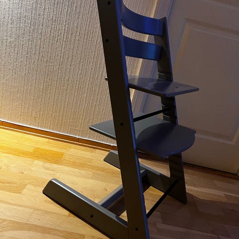 Stokke høy barnestol i svart tre. Stolen har et justerbart sete og fotstøtte for tilpasning til barnets størrelse.