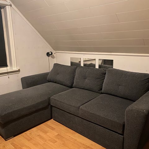 Selger en grå brukt tre seter sofa, sofaen har en synlig brukt merke som viser på bildet.