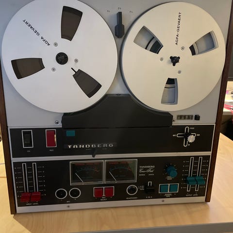 Båndspiller og båndopptaker. Den spoler en vei, men ikke den andre. Volumknapp er knekt litt. Mål: 40 x 41 x 18