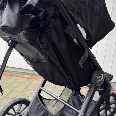 Baby Jogger Dobbel Barnevogn i svart farge. Designet for to barn med separate regulerbare seter og solskjermer. Enkel å legge sammen,drar bare i to håntak (Se bilde) Egnet for bruk med små barn eller tvillinger. Noen bruksmerker (se bilder)men vognen er i fin stand.