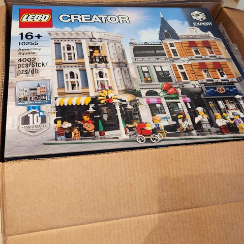 LEGO Creator Modular Building Sett med flere etasjer og detaljerte fasader. Inkluderer minifigurer og tilbehør som biler og trær. Bygget i plastmateriale, egnet for samling eller bygging.