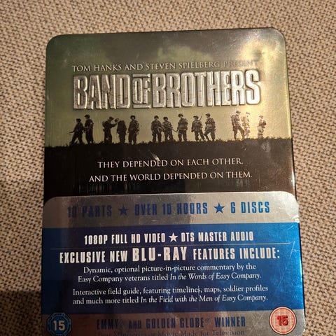 Band of Brothers Blu-ray Steelbook med flere disker som inneholder hele serien. Inkluderer ekstramateriale som behind-the-scenes, intervjuer og dokumentarer. Passer for samlere og fans av serien.