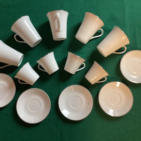 En asjett har en sprekk. Skal ellers være I hel stand, brukspor/krakel på noen deler finnes.
