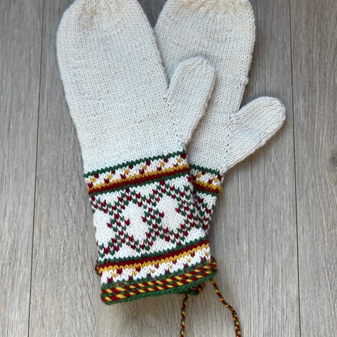 Hjemmestrikkede ullvotter i lyst grått og rødt, med en smal endebord i lysegrønt og rødt. Ubrukte. Jeg har ingen kvittering, for disse er hjemmestrikkede, men jeg anslår garnverdien til ca 300, og så kommer arbeidet i tillegg.