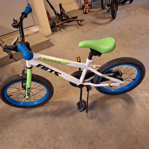 DBS barnesykkel med 16 tommers hjul, designet for unisex bruk. Sykkelen har en ramme tilpasset barn, med kjedebeskyttelse og håndbremser. Fargene på sykkelen inkluderer svart, rød og hvit.