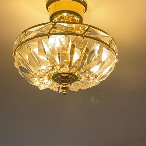 Taklampe i antikk hvit farge med dekorative krystallpynt. Lampen har flere armer med plass til lyspærer, og er laget i metall med detaljer i antikk stil. Passer for montering i tak og gir et klassisk utseende.