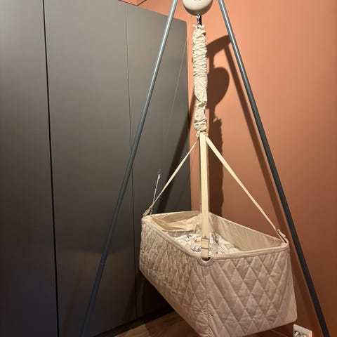 Leander vugge designet for babyer. Vuggen har en rund form med en pute for komfort. Den er laget med materialer som gir støtte og trygghet for barnet. Stativ og sengelinned følger med.