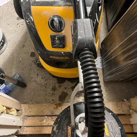 Mirka elektrisk stangsliper med lang stang, gul og svart farge. Egnet for sliping på vanskelig tilgjengelige steder.