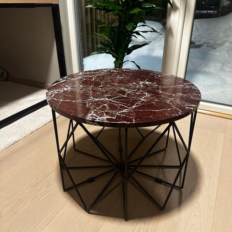 Selger et Saigon sofabord kjøpt på Novasolo, i solid mangotre med metallramme. Bordet har et rått, industrielt uttrykk og er både praktisk og dekorativt.