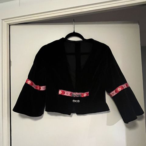 50-talls, nydelig vintage håndlaget jakke av vevd stoff med vakkert mønster. Nydelige detaljer med flotte knapper, lommer, hemper klart for belte og skulderputer. Hoftelang og innsvinget, formsydd.