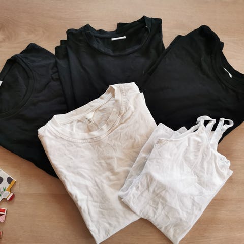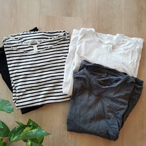 Klespakke med gravidkle, str M/38. Noko godt brukt og noko ubrukt. Inneholder: 3 t-skjorter, 3 gensarar med kvart arm, 2 skjørt, 1 kjole, 2pkn strømpebukse.