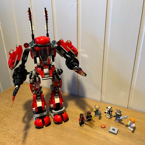 LEGO NINJAGO byggesett som inkluderer en mech robot med grønne vinger og sverd. Byggesettet består av flere detaljerte deler som kan settes sammen til en stor robotfigur. Passer for samlere og barn som er interessert i LEGO NINJAGO temaet.