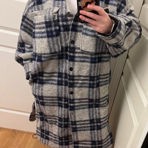 H&M kåpe i svart farge, laget av ullmateriale. Størrelse M for dame. Kåpen har dobbelspent knappelukking og er designet for kaldere vær.