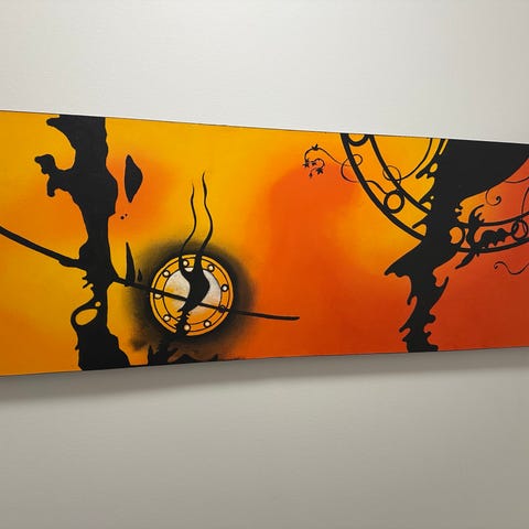 Abstrakt maleri med varme farger i nyanser av oransje, gult og rødt. Maleriet har organiske former og linjer som skaper et dynamisk og uttrykksfullt motiv. Passer som dekorasjon i ulike rom.