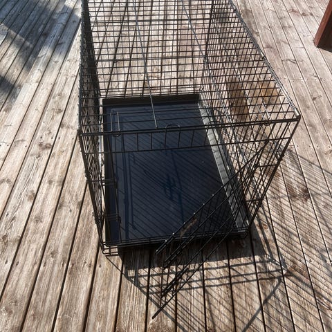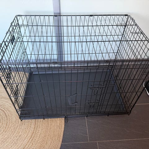 Hundebur i metall med svart plastbunn. Buret er sammenleggbart design for enkel transport og oppbevaring. Egnet for transport og opphold av hunder. Plast bunn kan tas ut for enkel renhold.