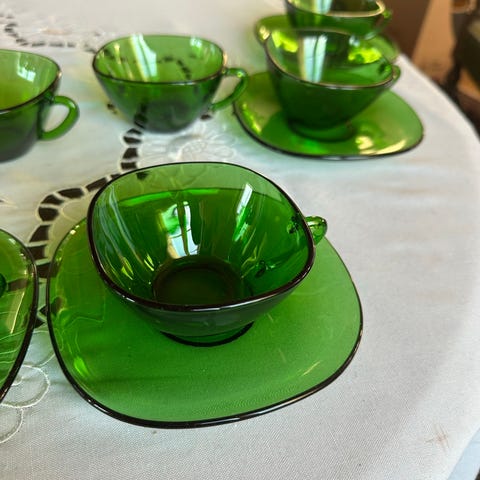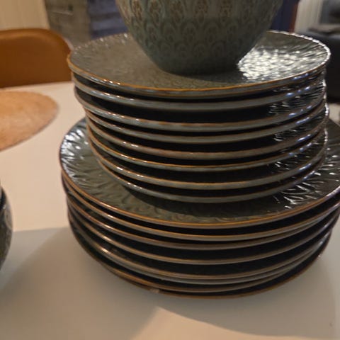 Kremmerhuset gullkopper og fat. Er 12 kopper og 11 fat da et fat mangler. Noen små bruksmerker her og der, men ikke noe særlig synlige.