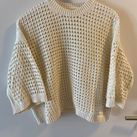 Holzweiler genser i størrelse M for dame. Genseren er hvit og laget av bomull. Den har en strukturert strikket design som gir et klassisk utseende.