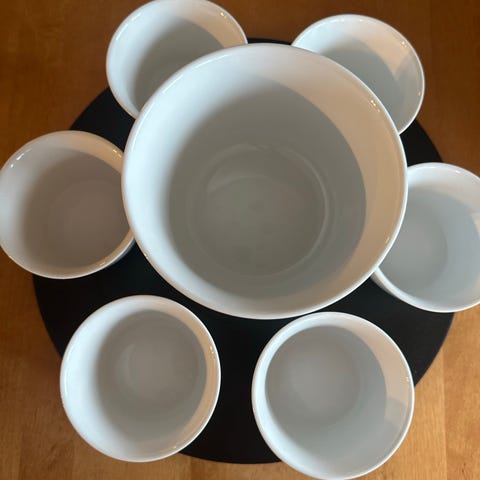 Aldri brukt. Stativ med telysholder for å holde sausen varm, kar og fire gafler. 🍫🤎