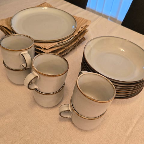 Godt brukt servise fra IKEA, og godt brukt bestikk fra Europris selges. Brukt av en familie på 5 med små barn til daglig. Prøvd så godt jeg kan å ta bilde av bruksmerker med et ødelagt kamera…