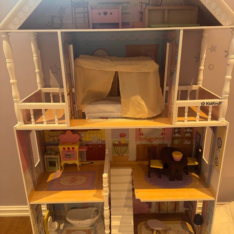 Dukkehus med dobbelt sett møbler og med flere dukker som medfølger, alt som avbildet.