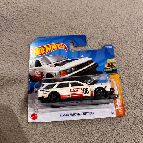 Hot Wheels Nissan Maxima Drift Car i blå farge. Modellbil laget i metall og plast, egnet for samling eller lek.