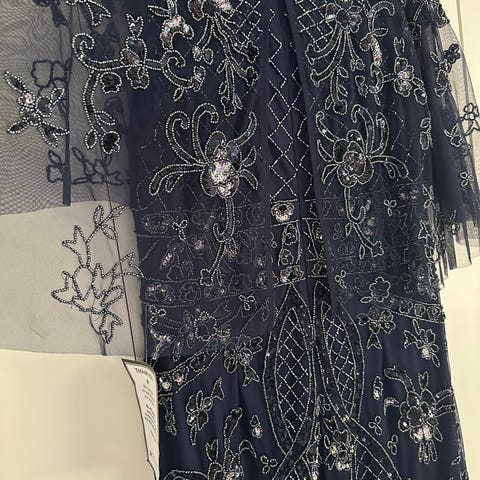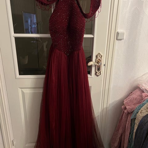 Festkjole i størrelse 38, farge grønn, designet for kvinner. Kjolen har dekorative mønstre og detaljer som gir et unikt utseende.