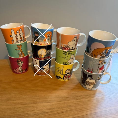 Selger eller bytter Mummikopper i ypperlig stand! Snorkfrøken og Mymlens mamma. 150 kr pr stk eller send bilder av kopp du ønsker bytte med.